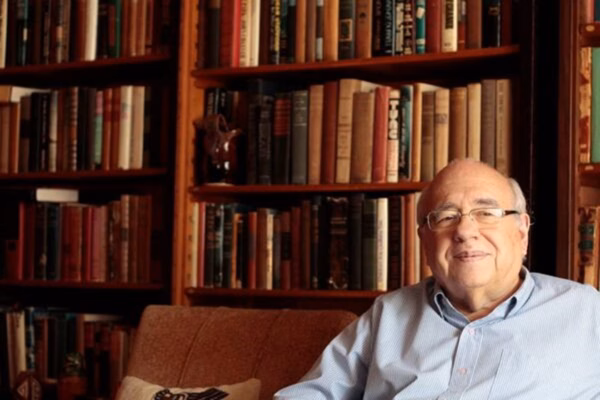 Luis Fernando Veríssimo posa na biblioteca